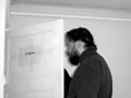 Грей пытается перемешать содержимое третьей кружки справа. |